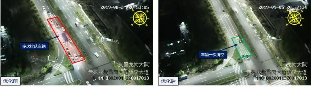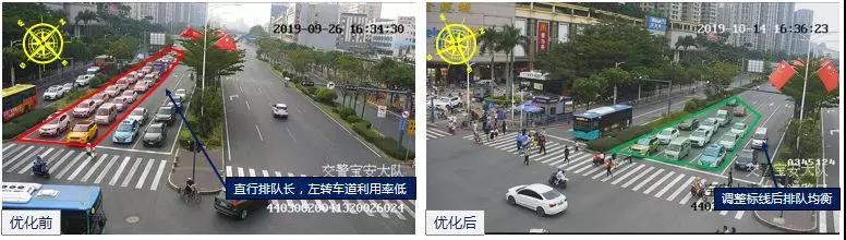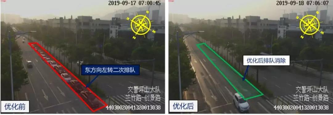 針對這一問題,深圳交警根據(jù)路口各時段、各方向的通勤需求,調(diào)整優(yōu)化了路口紅綠燈配時方案,適當(dāng)增加了擁堵方向時間。優(yōu)化后,路口晚高峰西往東方向車輛排隊由300多米降至60米左右,下降80%,車輛基本實(shí)現(xiàn)1次通行。