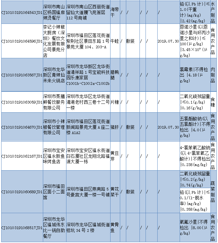 見(jiàn)圳客戶端 ·深圳新聞網(wǎng)2019年11月6日訊 11月5日,深圳市市場(chǎng)監(jiān)督管理局發(fā)布2019年第四十期食品安全抽樣檢驗(yàn)情況通報(bào),通報(bào)稱(chēng),深圳市市場(chǎng)監(jiān)督管理局于2019年8-9月組織對(duì)我市餐飲環(huán)節(jié)的食品開(kāi)展了抽樣檢驗(yàn)工作,本次共抽檢餐飲環(huán)節(jié)食品671批次,涉及餐飲環(huán)節(jié)經(jīng)營(yíng)主體584家次,共檢測(cè)食品指標(biāo)3385項(xiàng)次。其中檢出不合格樣品12批次,涉及不合格食品類(lèi)別有酒類(lèi)2批次均為米酒;肉制品2批次為臘肉和臘鴨腿;食糖1批次、食用農(nóng)產(chǎn)品5批次牛蛙、豬肝等在列;蔬菜制品1批次、水產(chǎn)制品1批次。