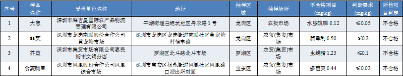 見圳客戶端·深圳新聞網(wǎng)2019年11月12日訊 11月11日,深圳市市場監(jiān)督管理局發(fā)布9月16日-9月20日深圳市農(nóng)產(chǎn)品質(zhì)量安全豬肉和蔬菜例行監(jiān)測結(jié)果。2019年9月16日-9月20日,深圳市市場監(jiān)督管理局在全市監(jiān)測豬肉產(chǎn)品53份,抽檢結(jié)果顯示全部樣品合格。抽檢蔬菜共124份,4份抽樣樣品不合格,都為農(nóng)藥檢測超標(biāo)。其中,深圳市海吉星國際農(nóng)產(chǎn)品物流管理有限公司銷售的大蔥水胺硫磷超標(biāo),深圳市龍崗南聯(lián)股份合作公司黃龍?zhí)潦袌鲣N售的韭菜腐霉利超標(biāo),深圳市集貿(mào)市場有限公司惠民街市文錦分店銷售的芥藍蟲螨腈超標(biāo),深圳市鳳凰股份合作公司鳳凰綜合市場銷售的食莢豌豆多菌靈超標(biāo)。