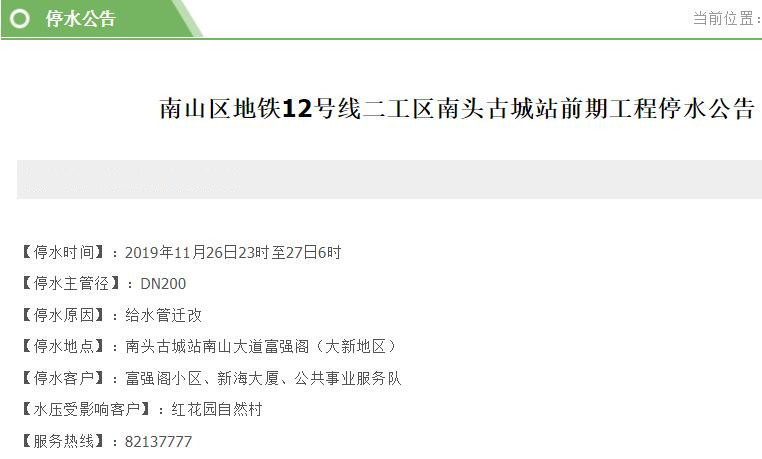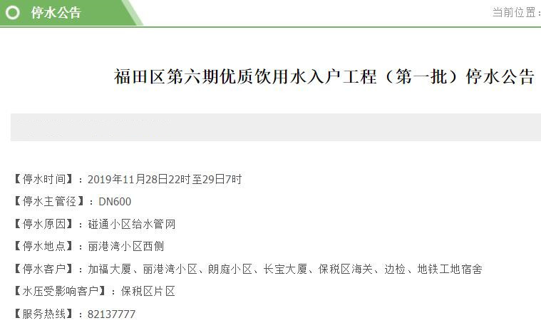 停水客戶:加福大廈、麗港灣小區(qū)、朗庭小區(qū)、長(zhǎng)寶大廈、保稅區(qū)海關(guān)、邊檢、地鐵工地宿舍