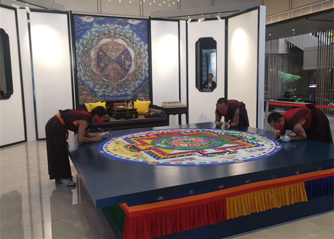 在活動(dòng)現(xiàn)場(chǎng),壇城沙畫的現(xiàn)場(chǎng)制作格外引人注目?!耙簧骋皇澜?,一葉一菩提”——壇城沙畫的過程仿佛一場(chǎng)視覺的盛宴。據(jù)了解,壇城是指對(duì)一座宮殿一個(gè)世界的泛義,用珍貴珊瑚、瑪瑙、綠松石等礦物質(zhì)研磨成粉,落沙即成畫,畫面立體生動(dòng),壇城展示了高度的藝術(shù)魅力和視覺觀感。