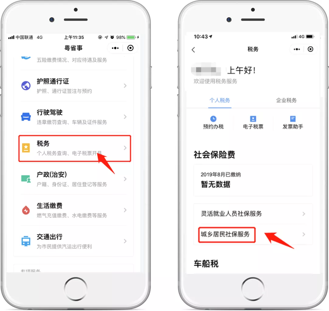 在“粵省事”小程序首頁點(diǎn)擊“稅務(wù)”服務(wù),在“個(gè)人稅務(wù)”板塊找到“社會保險(xiǎn)費(fèi)”—“城鄉(xiāng)居民社保服務(wù)”(暫不支持深圳地區(qū))。