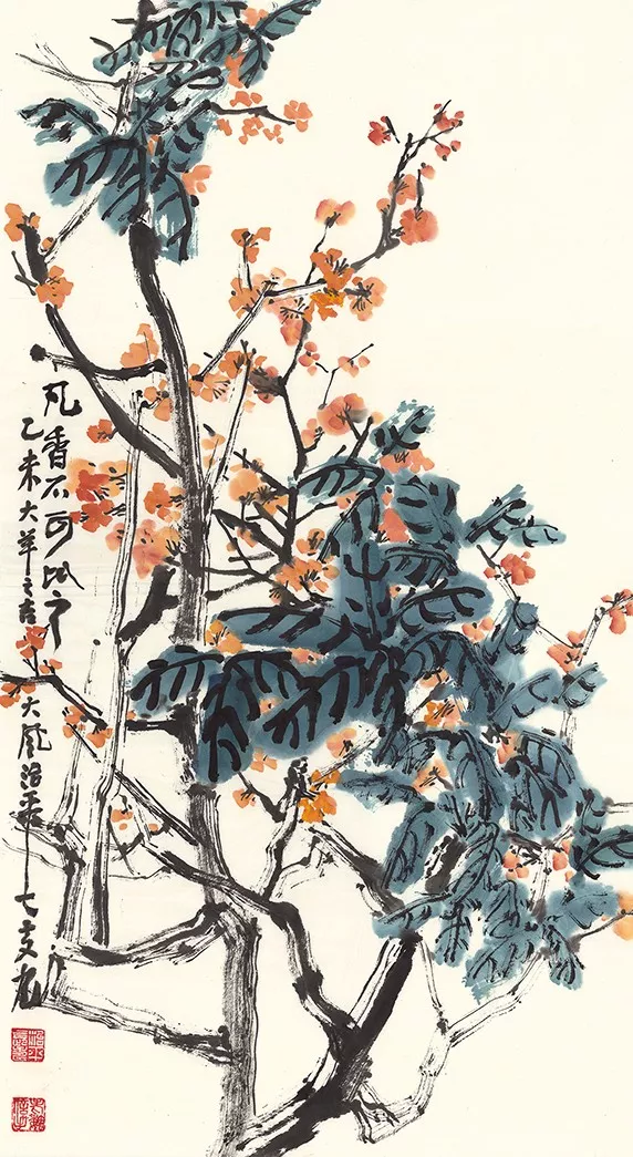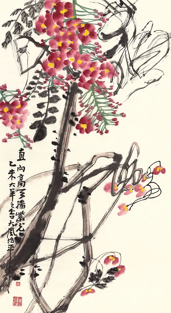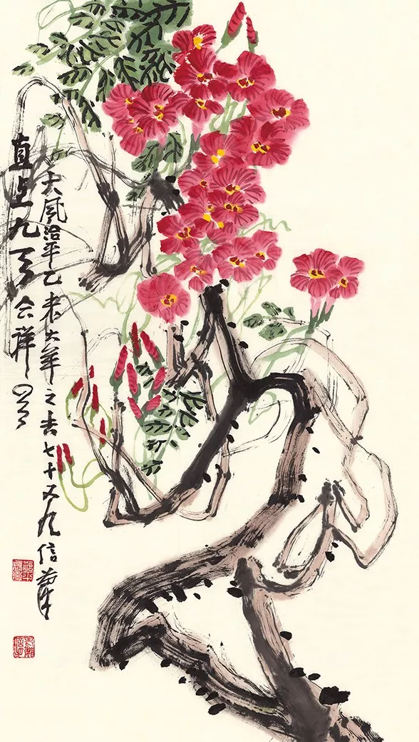 魏治平的藝術(shù)貴于創(chuàng)造,以書法入畫,畫中常見有篆書筆意。三十年前長(zhǎng)江日?qǐng)?bào)總編海洋先生,曾提筆寫下《魏瘋子傳奇》,洋洋灑灑八千言,一時(shí)間荊楚大地震動(dòng)。西泠印社理事朱妙根稱其“方寸之間有靈山,紅花墨葉又一派”。西泠印社執(zhí)行社長(zhǎng)、中國(guó)印學(xué)博物館館長(zhǎng)劉江先生為其第一本書畫作品集題簽書名。美國(guó)前總統(tǒng)老布什收有魏老書法作品“龍蛇競(jìng)走舞長(zhǎng)空、點(diǎn)染梅花分外紅。且賦新詩遙寄意,長(zhǎng)江密水兩相通”。印第安納州州立大學(xué)博物館大廳懸掛的便是魏老八尺紅梅詩書畫中堂。