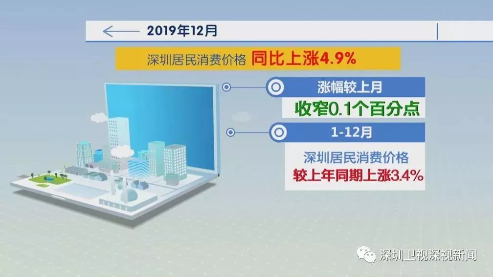 2019年12月份,深圳居民消費(fèi)價(jià)格(CPI)環(huán)比下降0.2%,較上月低0.7個(gè)百分點(diǎn);CPI同比上漲4.9%,漲幅較上月收窄0.1個(gè)百分點(diǎn)。1-12月,深圳居民消費(fèi)價(jià)格較上年同期上漲3.4%。