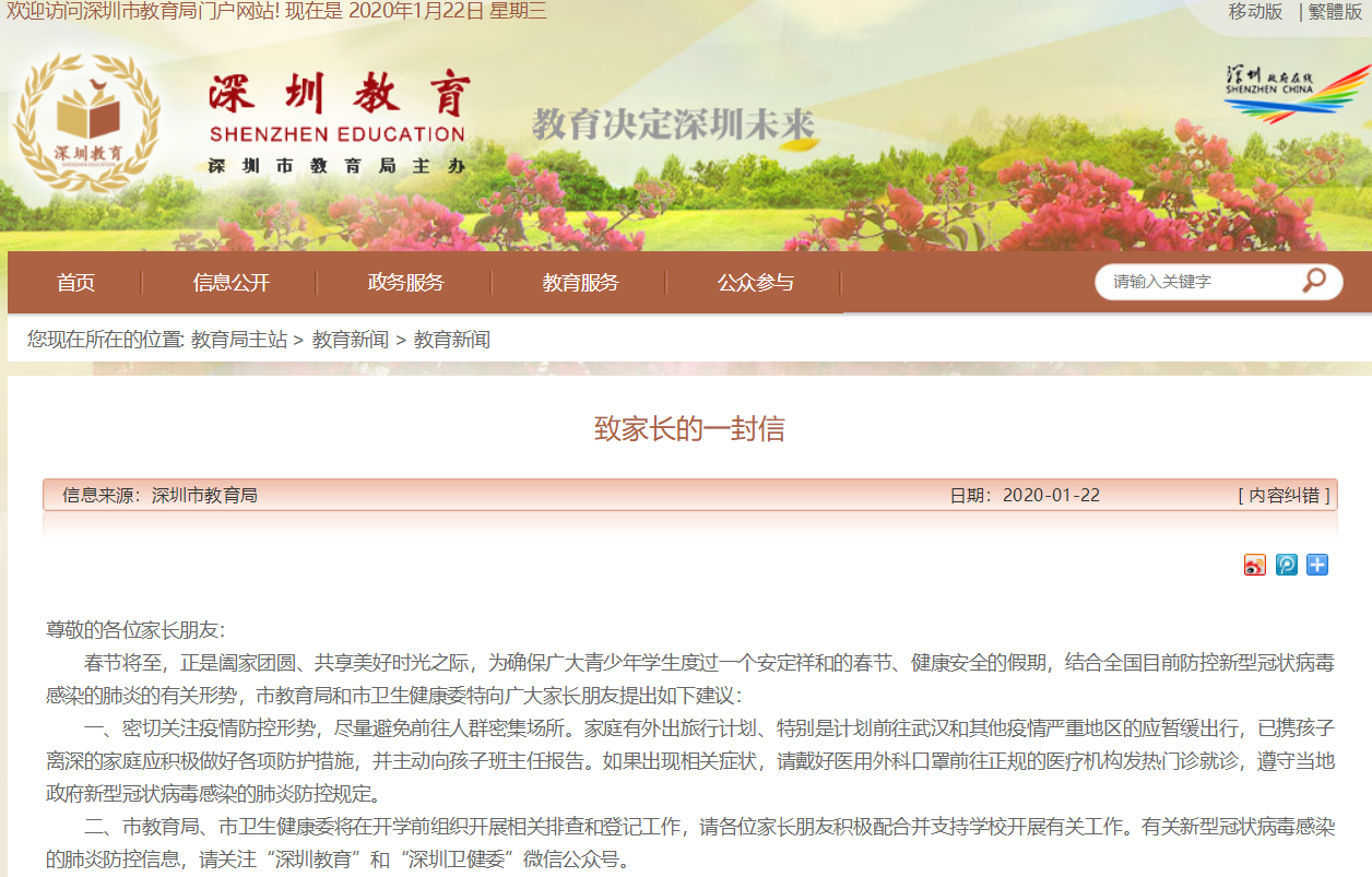 此外,市教育局和市委建委聯(lián)合致信家長,建議家長朋友密切關(guān)注疫情防控形勢,盡量避免前往人群密集場所,計劃前往武漢和其他疫情嚴(yán)重地區(qū)的應(yīng)暫緩出行。已攜孩子離深的家庭應(yīng)積極做好各項(xiàng)防護(hù)措施,并主動向孩子班主任報告。如果出現(xiàn)相關(guān)癥狀,請戴好醫(yī)用外科口罩前往正規(guī)的醫(yī)療機(jī)構(gòu)發(fā)熱門診就診,遵守當(dāng)?shù)卣滦凸跔畈《靖腥镜姆窝追揽匾?guī)定。市教育局和市衛(wèi)生健康委將在開學(xué)前組織開展相關(guān)排查和登記工作。