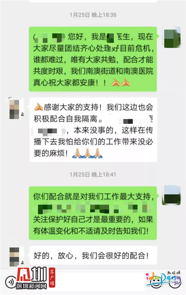 他們就是南澳人民醫(yī)院的醫(yī)療工作人員。在這次疫情中,市二醫(yī)院、新區(qū)醫(yī)療健康集團聯(lián)動,指導(dǎo)南澳人民醫(yī)院流動社康醫(yī)務(wù)人員積極落實大鵬新區(qū)關(guān)于社區(qū)“1+3”工作小組的工作部署,針對這11位武漢同胞的情況,工作人員馬上與他們建立了微信群,在線對他們核實了身份。