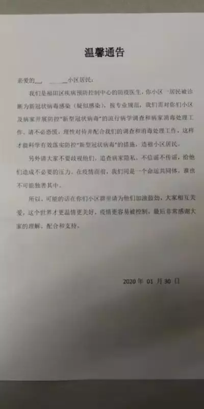 1月30日,由于深圳一小區(qū)出現(xiàn)新冠狀病毒疑似感染病例,福田區(qū)疾病預(yù)防控制中心的防疫醫(yī)生發(fā)布了這則通告。通告除了呼吁小區(qū)居民配合調(diào)查及消毒處理工作外,還特地懇請大家“不要歧視,在疫情面前,我們是同一個命運共同體,誰也不可能獨善其身。”不知為何,雖不是湖北人也未曾受過歧視,但還是被這寥寥數(shù)字的“請求”溫暖了。