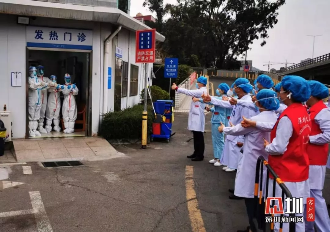 大年初一早上九點(diǎn),深圳市第二人民醫(yī)院發(fā)熱門診門口,院長正在帶隊(duì)慰問在發(fā)熱門診一線“戰(zhàn)疫”的工作人員,因?yàn)樘幱诿舾胁^(qū),發(fā)熱門診的工作人員只能這樣全幅武裝地表達(dá)決心。