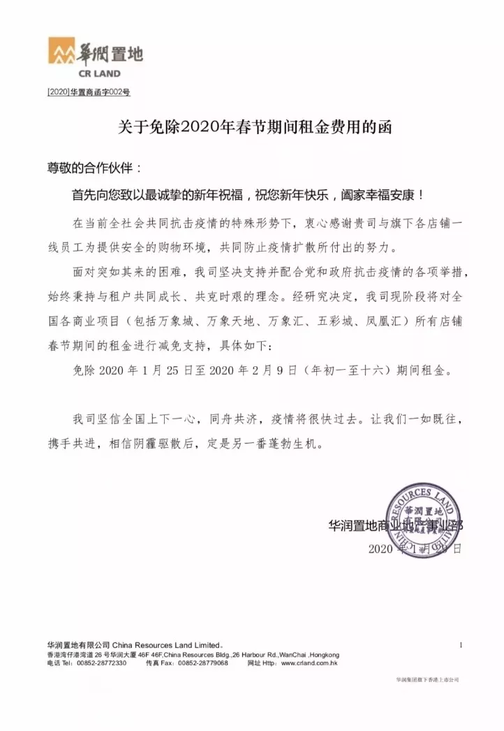 華潤(rùn)置地宣布免收1月25日—2月9日全國(guó)所有商業(yè)項(xiàng)目的租金,與商戶攜手共進(jìn)。