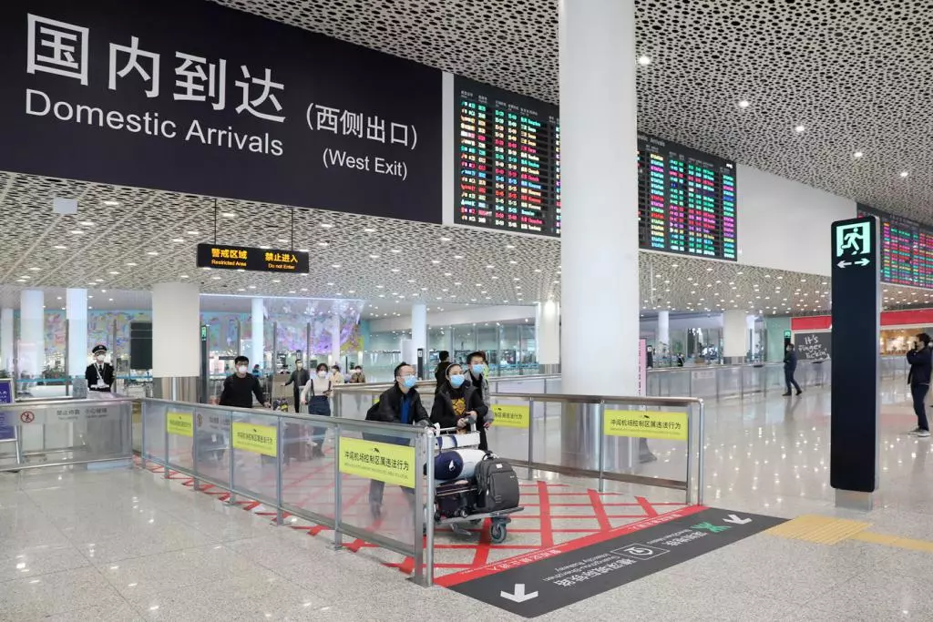 通過體溫檢測(cè)后,旅客走出機(jī)場(chǎng)出站口。