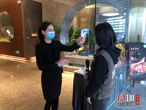 春江潮餐廳對進(jìn)店人員測量體溫。