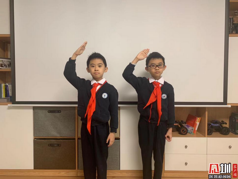 網(wǎng)上開學(xué)第一天,雙胞胎學(xué)生穿好禮服、佩戴紅領(lǐng)巾,莊嚴(yán)地敬禮。