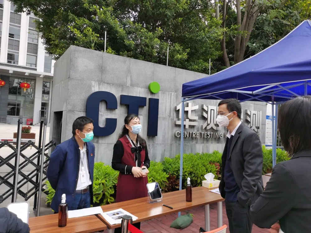 隨后,集團社康管理中心負責人和興東社康醫(yī)務(wù)人員到社區(qū)內(nèi)的重點企業(yè)——華測檢測認證集團股份有限公司,開展復(fù)工復(fù)產(chǎn)防疫工作,指導管理人員學習如何正確戴口罩、洗手、測體溫,口罩回收注意事項、如何避免登記人員信息時感染等等。