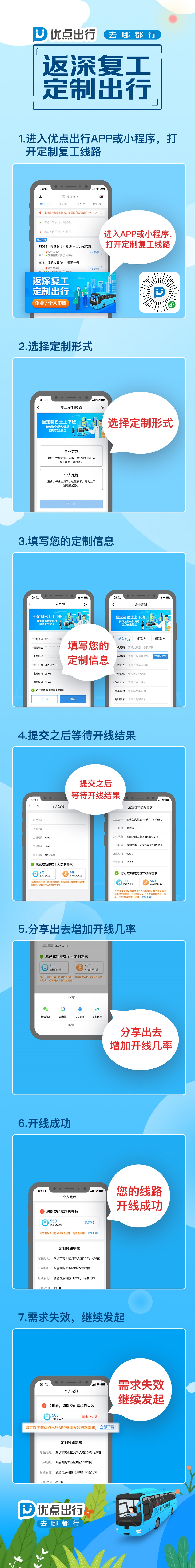 復工企業(yè)和個人在“優(yōu)點出行”APP或“優(yōu)點巴士”小程序中提交申請、填寫復工出行需求,由優(yōu)點出行平臺聚合生成復工專線并通知乘客,深圳巴士集團提供安全消毒的車輛進行乘客運輸。