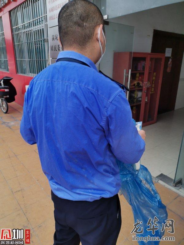 接到有返深人員的通知,他立刻帶隊(duì)趕往現(xiàn)場(chǎng),多次測(cè)溫后仍體溫偏高,他不放心地叫來(lái)三位一體人員,一番確認(rèn)之后,將發(fā)熱人員送往醫(yī)院,他則獨(dú)自善后對(duì)樓道進(jìn)行消毒,將近兩個(gè)小時(shí)的折騰,他終于得以到垃圾桶旁邊喘口氣。額頭勒出的印痕和黏在后背的制服,都是每一天的勛章。