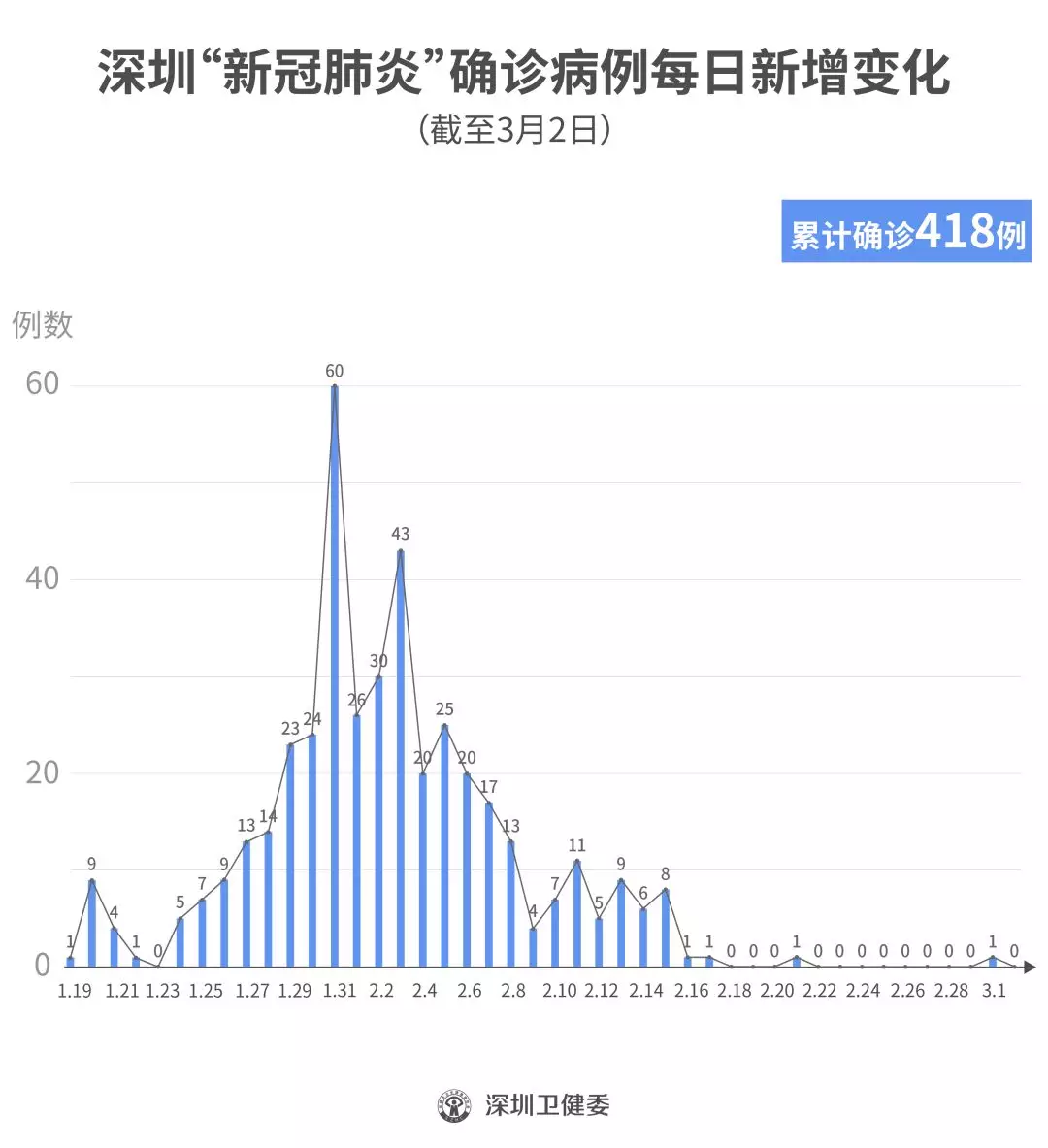 見圳客戶端·深圳新聞網2020年3月3日訊 截至3月2日24時,深圳累計報告“新冠肺炎”確診病例418例。3月2日當天全市無新增確診病例,當天出院病例12例(從2月26日起不再公布出院個案)。
