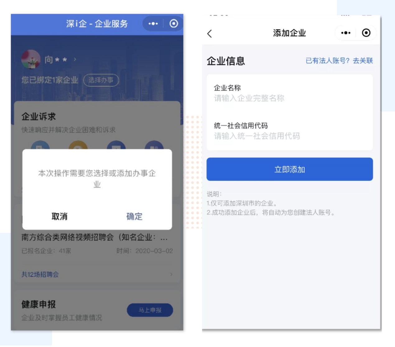 登錄后,進入“深i企-精準服務企業(yè)”平臺主頁面,點擊“選擇辦事”。法人或經(jīng)辦人通過輸入企業(yè)名稱和統(tǒng)一社會信用代碼添加辦事企業(yè),也可以通過已有法人賬號關聯(lián)企業(yè)。