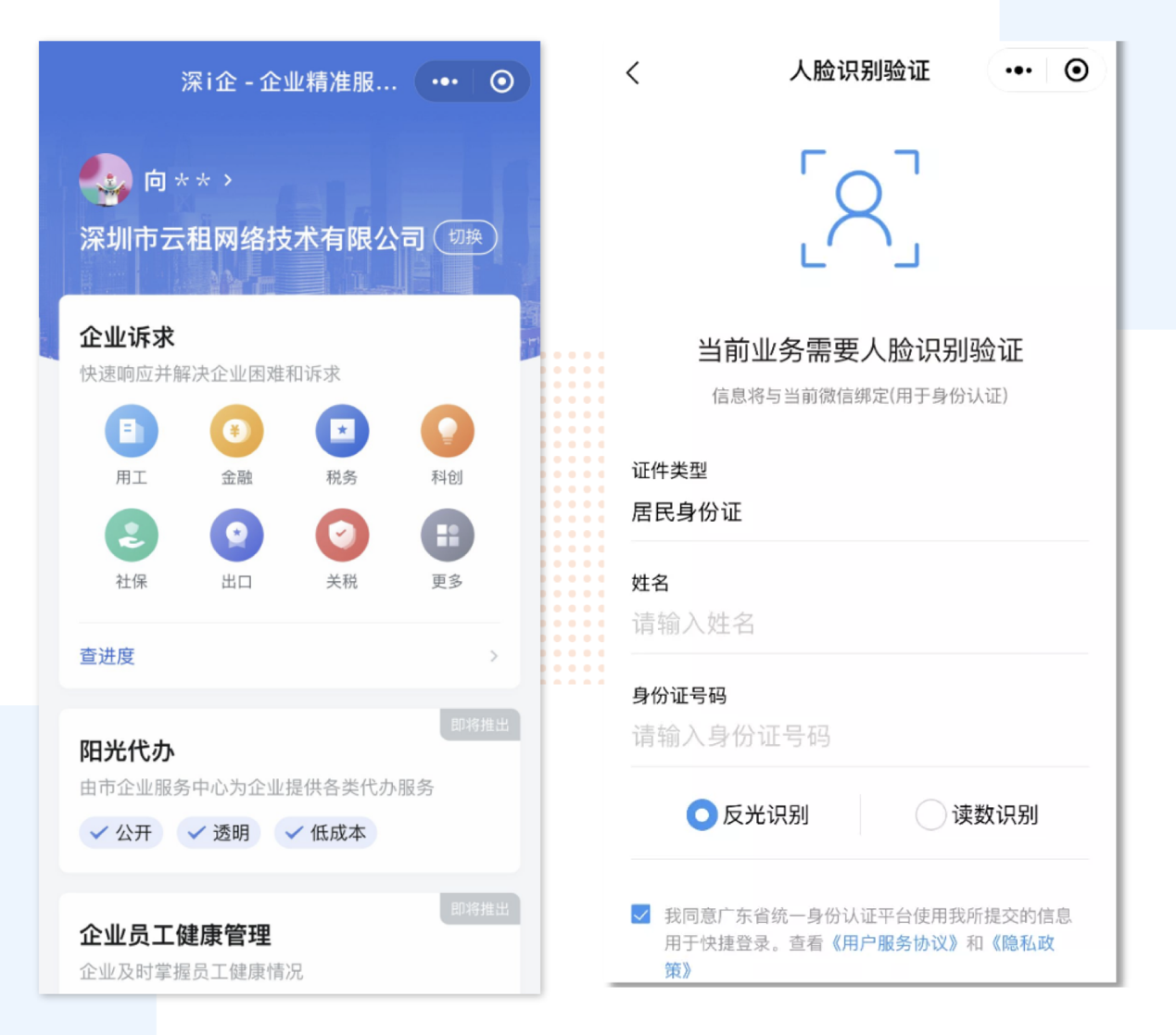 企業(yè)法人或經(jīng)辦人進入“深i企-精準服務服務”平臺,選擇登錄,進入實名認證環(huán)節(jié)。輸入姓名和證件號碼后,通過人臉識別即可完成實名認證。