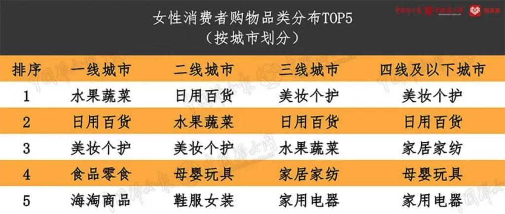 ▲在各個(gè)地區(qū),美妝個(gè)護(hù)、日用百貨類的商品都是女性消費(fèi)者的最愛