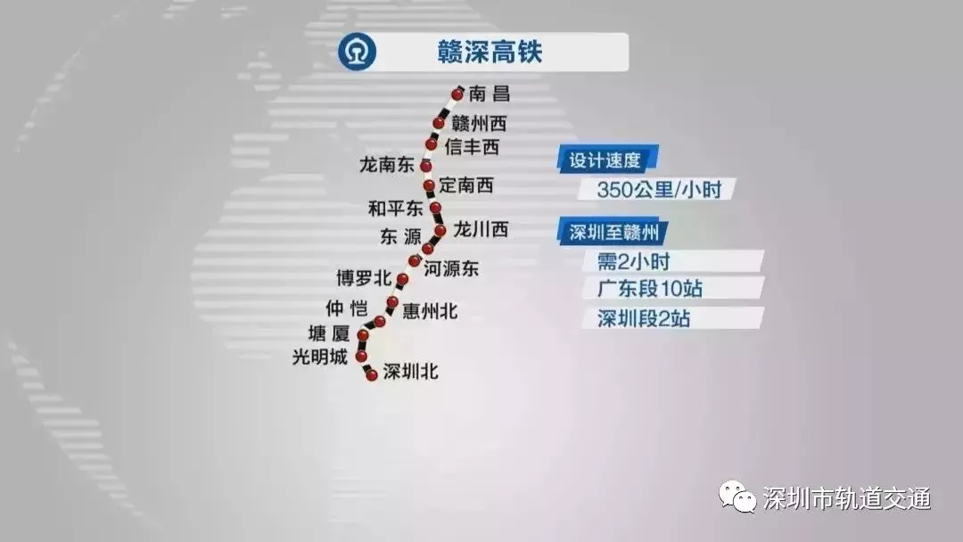 贛深鐵路線路縱貫江西、廣東兩省,沿線途經(jīng)贛州、河源、惠州、東莞、深圳等地市,長(zhǎng)度436.367公里。其中,江西省境內(nèi)134.567公里,廣東省境內(nèi)301.8公里。其中廣東段設(shè)有10站;深圳段設(shè)有2站,共32公里已投入建設(shè)。設(shè)計(jì)行車速度為350公里/小時(shí),規(guī)劃運(yùn)輸能力為5000萬人/年。