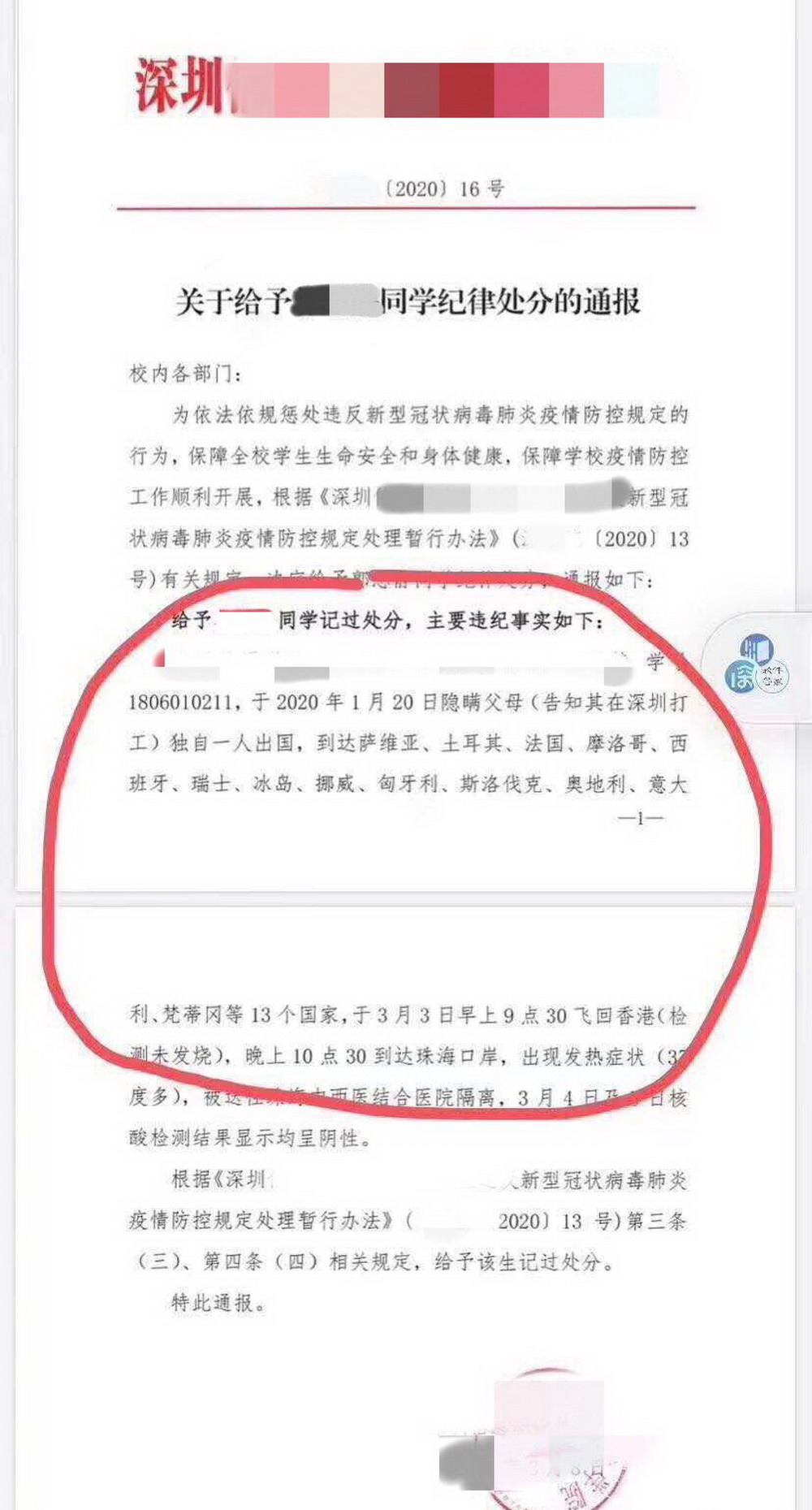 見(jiàn)圳客戶(hù)端·深圳新聞網(wǎng)2020年3月20日訊 近日,一位深圳女大學(xué)生小Y瞞著父母出游13國(guó),回國(guó)后因發(fā)熱被隔離并因未如實(shí)向?qū)W校匯報(bào)行程被處分,此事引發(fā)社會(huì)關(guān)注。3月18日,當(dāng)事人接受深圳新聞網(wǎng)記者采訪,詳述事件經(jīng)過(guò)并表達(dá)悔意。
