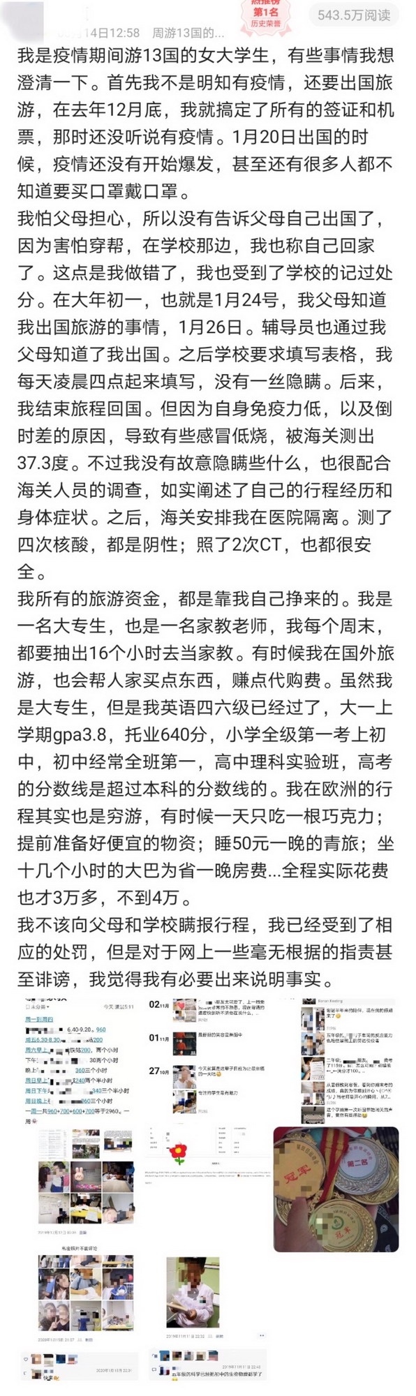 記者從小Y處了解到,1月20日,她出發(fā)開(kāi)始旅行并于3月3日從珠海入境回國(guó),期間共游玩13個(gè)國(guó)家?!?0月份就已經(jīng)決定出去玩,11月一直在準(zhǔn)備簽證,12月中旬簽證什么的都已經(jīng)準(zhǔn)備好了?!庇捎诤ε赂改笓?dān)心她一人在外旅行的安全問(wèn)題,出發(fā)時(shí)并沒(méi)有告知父母?!?月23日,學(xué)校要求所有學(xué)生填寫(xiě)一個(gè)假期所在地,我填寫(xiě)的是‘在家’,因?yàn)椴幌胱尲依锶酥牢以趪?guó)外,害怕穿幫。出發(fā)時(shí)國(guó)內(nèi)疫情還沒(méi)有爆發(fā),所以不是很清楚國(guó)內(nèi)的疫情,也沒(méi)想到填這個(gè)信息是為了防控疫情所用,所以沒(méi)有如實(shí)填寫(xiě)。大年初一,也就是1月24日,我父母知道了我出國(guó)的事,對(duì)我嚴(yán)厲批評(píng)。之后學(xué)校要求填寫(xiě)表格,我沒(méi)有隱瞞,都是如實(shí)填寫(xiě)?!?/p>