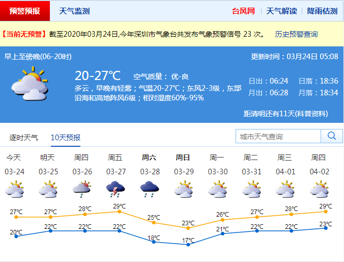 見(jiàn)圳客戶(hù)端·深圳新聞網(wǎng)2020年3月23日訊 深圳今天多云,早晚有輕霧;氣溫20-27℃;東風(fēng)2-3級(jí),東部沿海和高地陣風(fēng)6級(jí);相對(duì)濕度60%-95%。