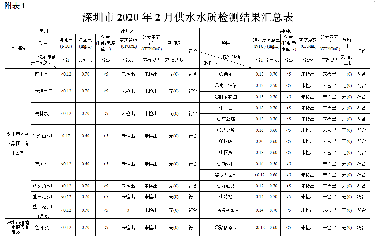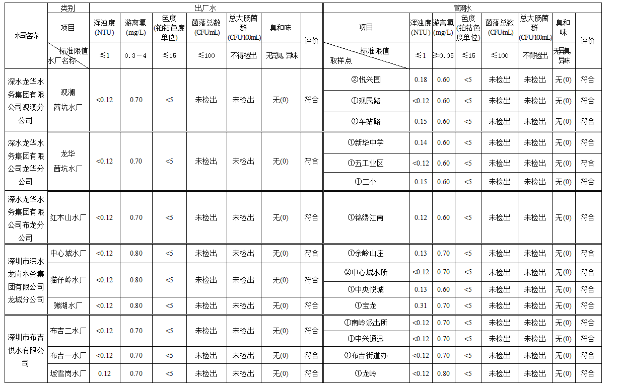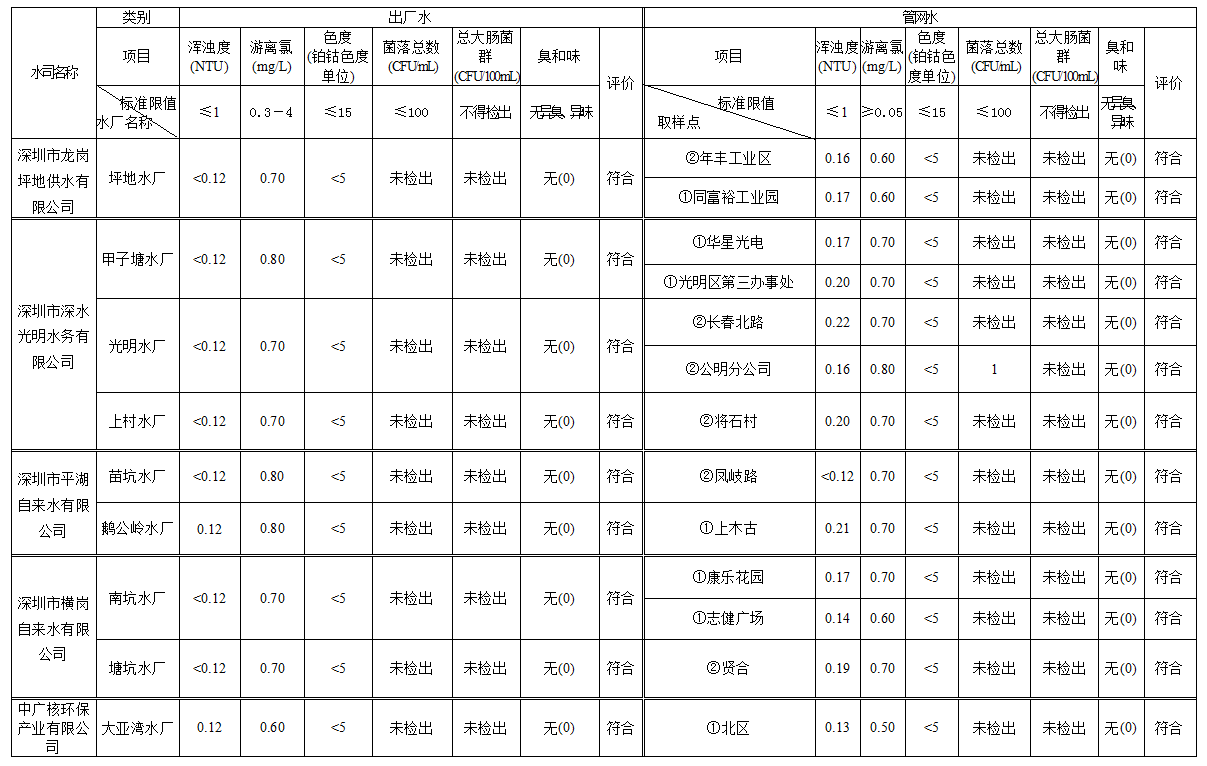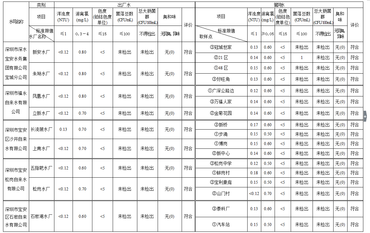 見圳客戶端·深圳新聞網(wǎng)2020年4月4日訊(見圳客戶端、深圳新聞網(wǎng)記者葉梅)2020年2月,深圳市水務(wù)局對全市42個水廠出廠水水樣以及68個管網(wǎng)水水樣進(jìn)行了抽檢。檢測結(jié)果表明,依據(jù)GB5749—2006《生活飲用水衛(wèi)生標(biāo)準(zhǔn)》,所有受檢42個出廠水水樣和68個管網(wǎng)水水樣的渾濁度、消毒劑(游離氯或二氧化氯或總氯)、色度、菌落總數(shù)、總大腸菌群及臭和味共6項常規(guī)指標(biāo)全部符合該標(biāo)準(zhǔn)的規(guī)定,出廠水水樣合格率為100%,管網(wǎng)水合格率為100%。