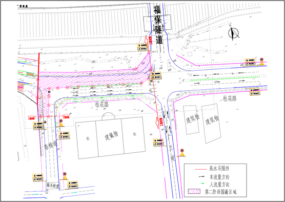 第二階段:對桂花路(福保隧道-香樟道段)北半幅(靠公園側(cè))進(jìn)行封閉占用施工,南半幅臨時(shí)調(diào)整為三車道,一車道西行(進(jìn)保稅區(qū)方向),兩車道東行(出保稅區(qū)方向)。行人及非機(jī)動(dòng)車輛可通過南側(cè)人行道通行。本階段預(yù)計(jì)施工時(shí)間為6月20日至8月20日,持續(xù)60天。