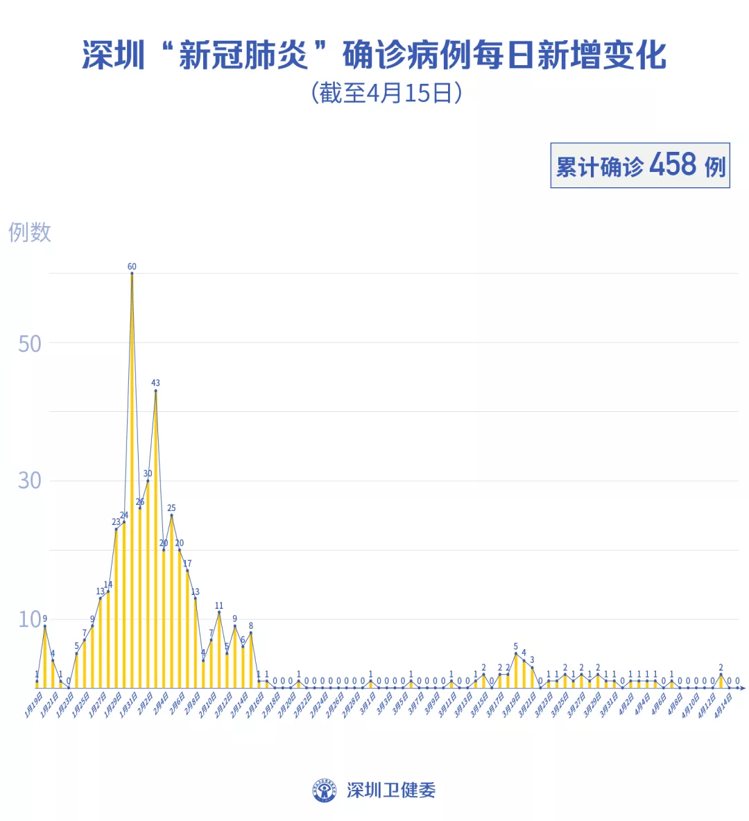 截至4月15日24時,深圳累計報告新冠肺炎病例458例。4月15日當天新增出院2例。