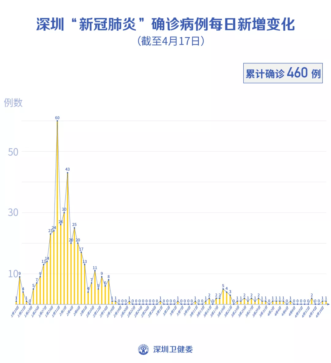 截至4月17日24時,深圳累計報告新冠肺炎病例460例。4月17日當天新增境內病例1例。