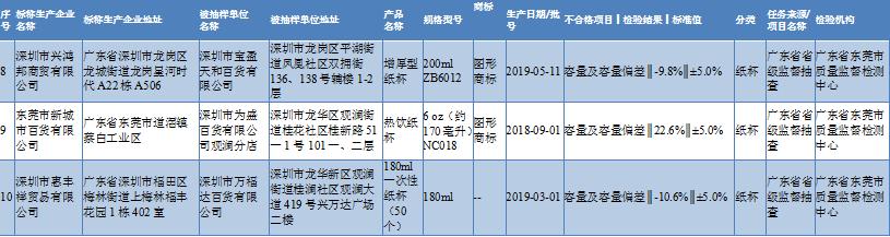 通告顯示,深圳抽檢的3批不合格樣品分別為深圳市寶盈天和百貨有限公司銷售的增厚型紙杯、為盛百貨有限公司觀瀾分店銷售的熱飲紙杯和萬福達(dá)百貨有限公司銷售的180ml一次性紙杯(50個(gè)),不合格項(xiàng)目均為容量及容量偏差不符合食品相關(guān)產(chǎn)品安全國家標(biāo)準(zhǔn)規(guī)定。