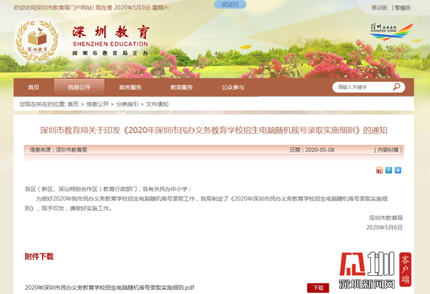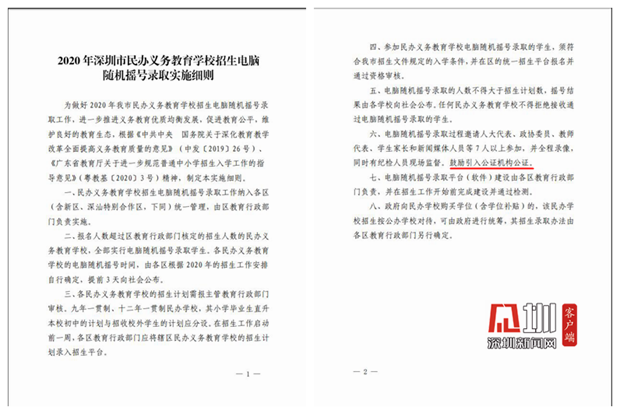 圖為深圳市民辦義務(wù)教育學(xué)校招生電腦隨機(jī)搖號錄取實施細(xì)則頁面截圖。