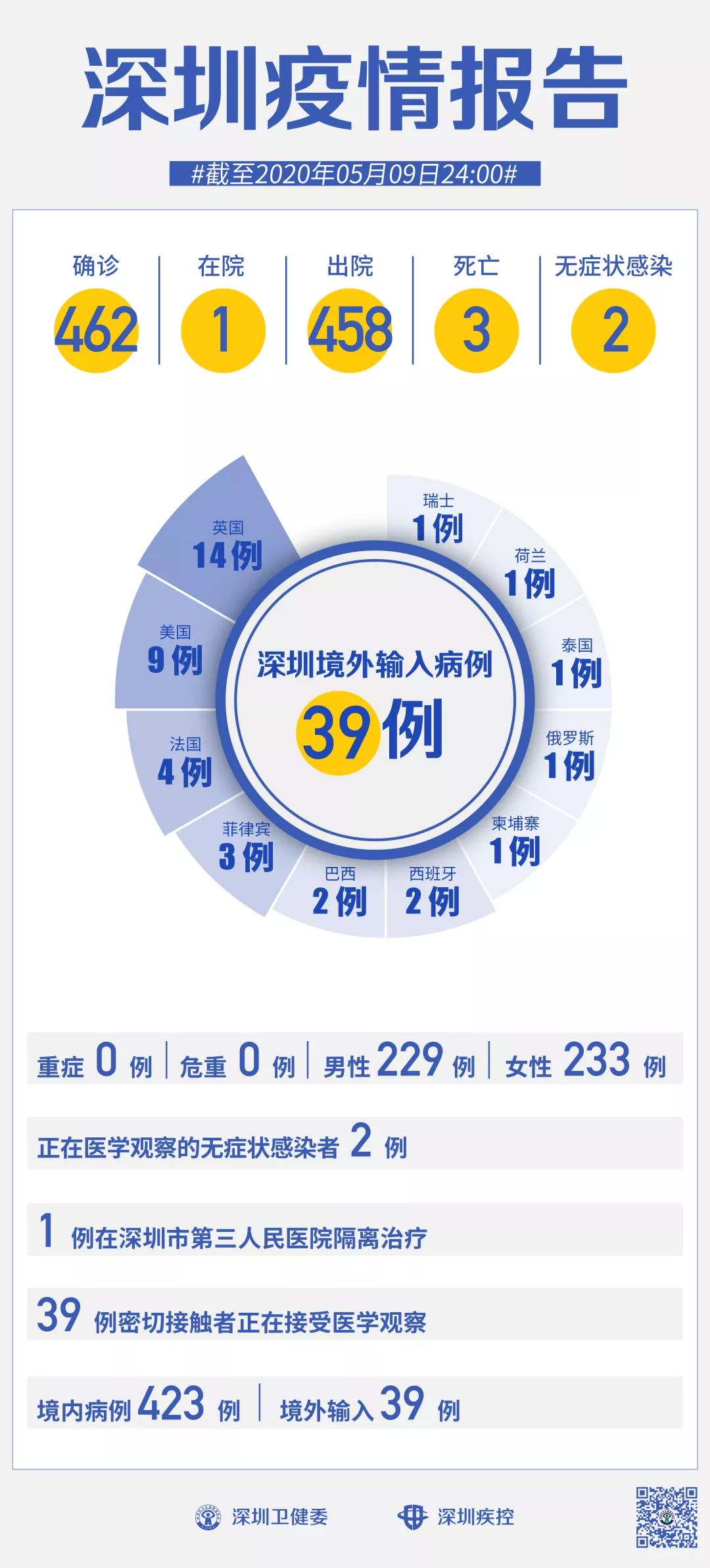 截至5月9日24時,深圳累計報告新冠肺炎病例462例。