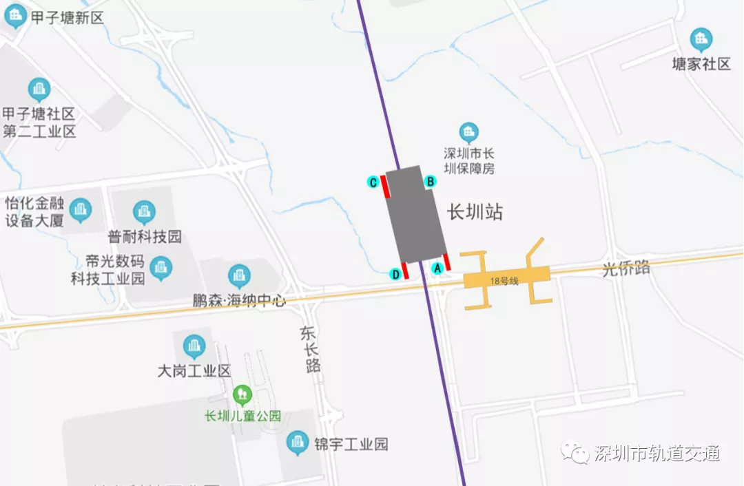 長(zhǎng)圳站位于科裕路與光僑大道交叉路口以北,沿科裕路路中呈南北向布置,車(chē)站為地上三層側(cè)式站臺(tái)鋼筋混凝土框架結(jié)構(gòu)。其中,車(chē)站出入口共計(jì)4個(gè):A出入口、B出入口、C出入口、D出入口。