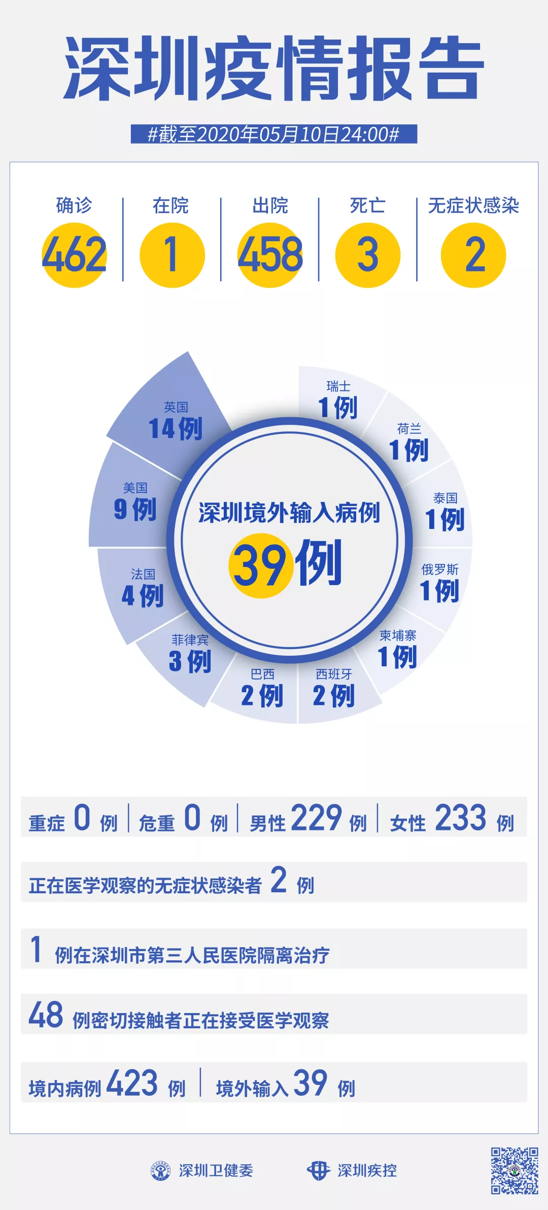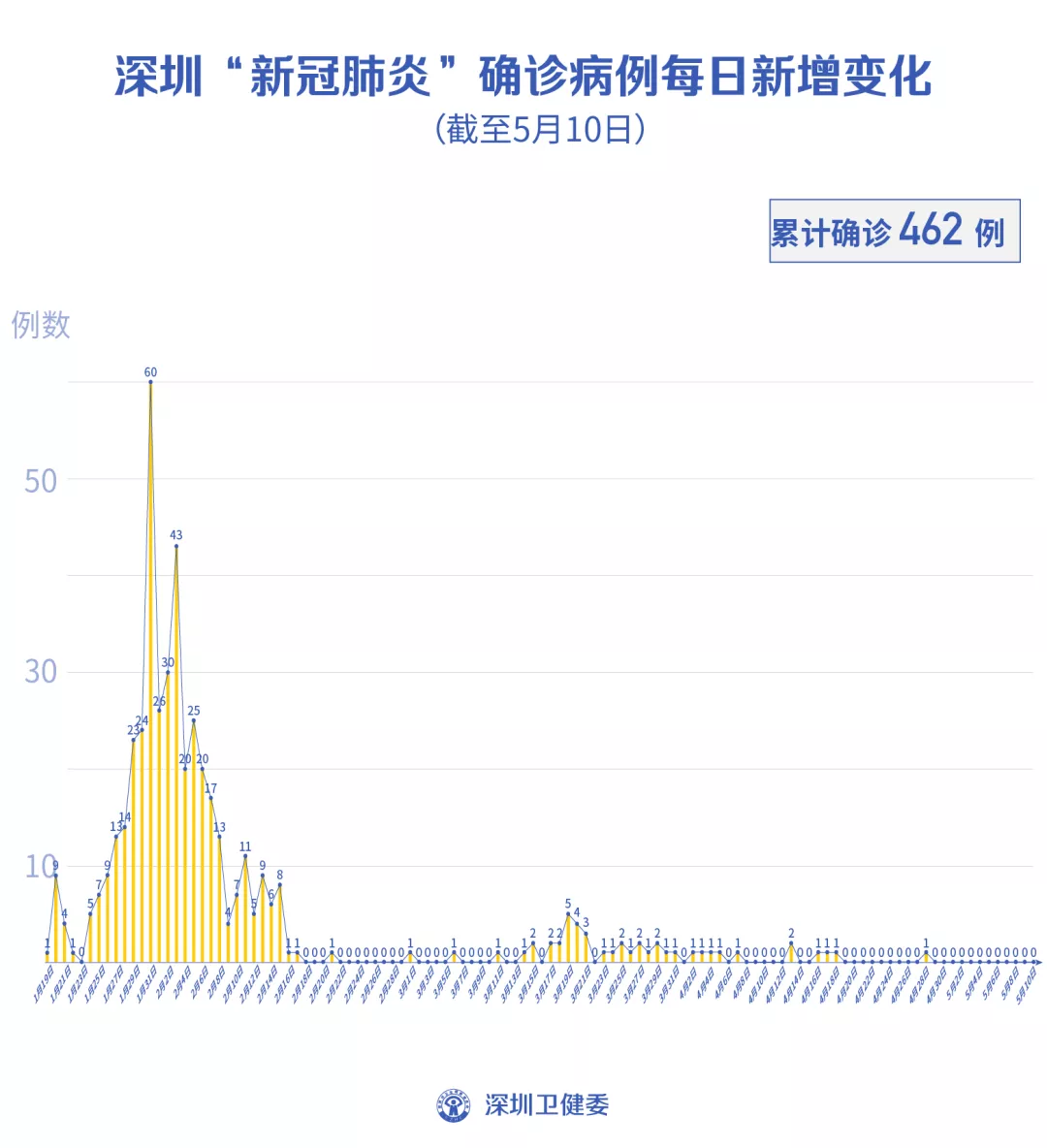 截至5月10日24時,深圳累計報告新冠肺炎病例462例。