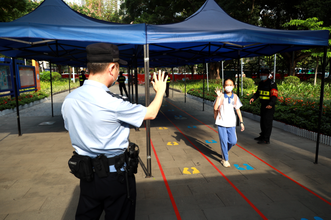綠樹陰濃夏日長,恰是讀書好時節(jié)。5月11日,深圳市第二批學(xué)生返校復(fù)課。按照深圳市公安局和福田區(qū)委區(qū)政府關(guān)于復(fù)學(xué)復(fù)課的部署要求,深圳市公安局福田分局全面開啟“護(hù)學(xué)模式”,做實做細(xì)各項防控舉措,為福田學(xué)子們營造安全有序的開學(xué)環(huán)境,全力護(hù)航校園安全。據(jù)統(tǒng)計,5月11日,福田公安分局共出動警力870人次,發(fā)動保安員1105人次、護(hù)學(xué)崗力量953人次,保障全區(qū)105所學(xué)校,10.6萬名學(xué)生安全返校復(fù)課。