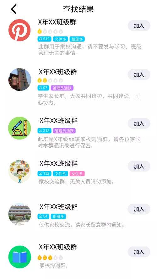 在QQ內搜索“班級群”、“年級群”等關鍵字,即可檢索出大量的班級群聊。