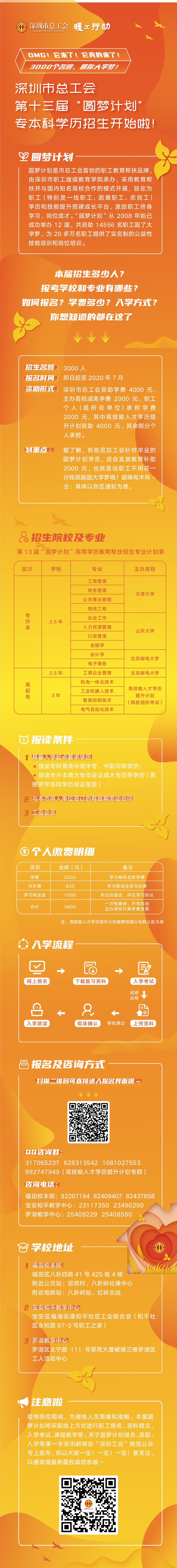 在疫情防控、復工復產的特殊形勢下,結合市總工會“暖工行動”相關要求,本屆“圓夢計劃”進一步提高幫扶精準性,向受疫情影響嚴重的企業(yè)和職工傾斜,推動企業(yè)和職工共擔責任、共克時艱,穩(wěn)定職工隊伍和就業(yè),努力做到職工多轉崗、少下崗、多就業(yè)、少失業(yè)。符合報名條件的職工可在“深圳工會”微信公眾號上進行報名,報名截止日期為7月30日,主辦方將根據(jù)報名人數(shù)分期分批組織入學考試。入學考試采用“文化素養(yǎng)+職業(yè)技能+工作實績”的多元評價方式,在“文化素養(yǎng)”為主體考試中增加工會基本知識,提高職工工會意識。所有錄取學員將于今年9月入學就讀,進行線上線下相結合的學習,在規(guī)定學制內修滿學分將獲得各高校頒發(fā)、國家承認的畢業(yè)證書。