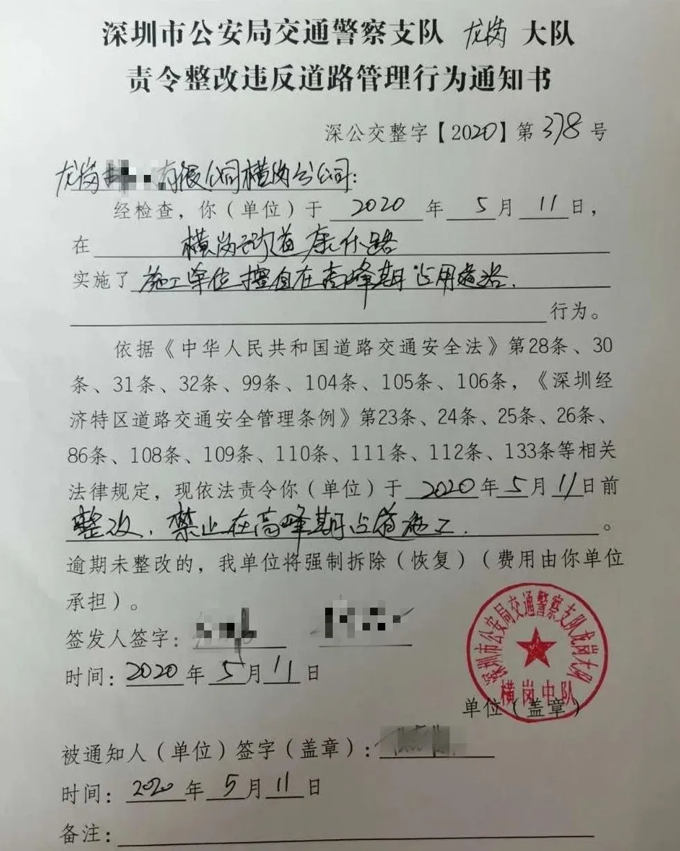 龍崗**有限公司橫崗分公司擅自在高峰期占用道路施工,執(zhí)勤民警責令立即整改、撤離現(xiàn)場。