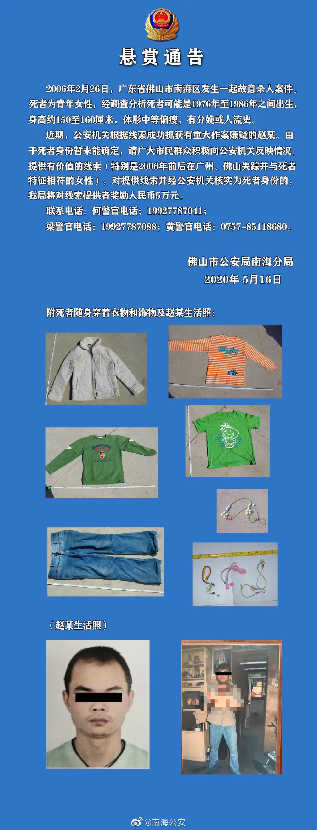 5月16日,廣東佛山市公安局南海分局官微發(fā)布了一條“懸賞公告”,尋找一起14年前的故意殺人案中被害女性的線索,警方將對(duì)有效線索提供者獎(jiǎng)勵(lì)人民幣5萬。