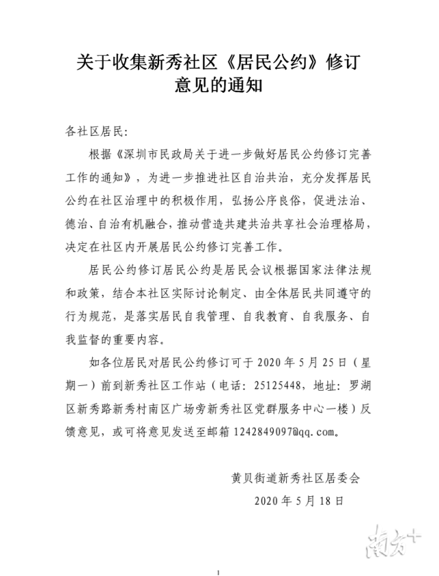 南方網(wǎng)2020年5月18日訊 垃圾分類、文明養(yǎng)犬、廣場舞不擾民……近日,一則社區(qū)居民公約征求意見稿貼在了深圳羅湖黃貝街道新秀社區(qū)的公告欄,成為居民們談論的熱門話題。
