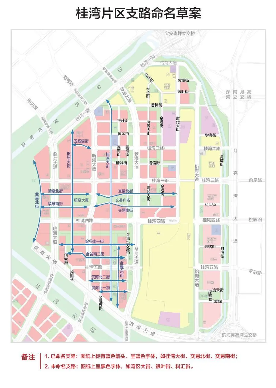 本次命名草案按照相關(guān)法規(guī)文件,結(jié)合前海桂灣、前灣、媽灣各片區(qū)的規(guī)劃定位、功能布局以及建設(shè)情況,針對三大片區(qū)和重要功能區(qū)功能、項目布局等特征,對前海15平方公里支路進行了全覆蓋命名。