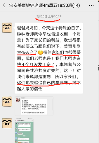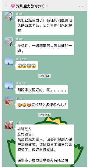 一名丁姓家長(zhǎng)介紹,5月20日,家長(zhǎng)接到美育老師消息,稱(chēng)公司剛剛宣布破產(chǎn),老師工資被拖欠4個(gè)月。家長(zhǎng)介紹,老師曝光該消息后,培訓(xùn)機(jī)構(gòu)支付了他們的拖欠工資。隨后大量老師離職。
