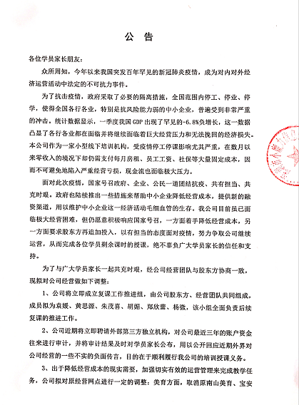 公告稱(chēng),公司成立由股東和老師組成的復(fù)課工作推進(jìn)組,申請(qǐng)?jiān)缛諒?fù)課,時(shí)間初定于6月中旬;并將聘請(qǐng)外部第三方獨(dú)立機(jī)構(gòu)審計(jì)賬戶(hù)資金,澄清不實(shí)經(jīng)營(yíng)傳言;還將取消寶安、南山兩個(gè)經(jīng)營(yíng)網(wǎng)點(diǎn),所有美育學(xué)生安排去福田上課。