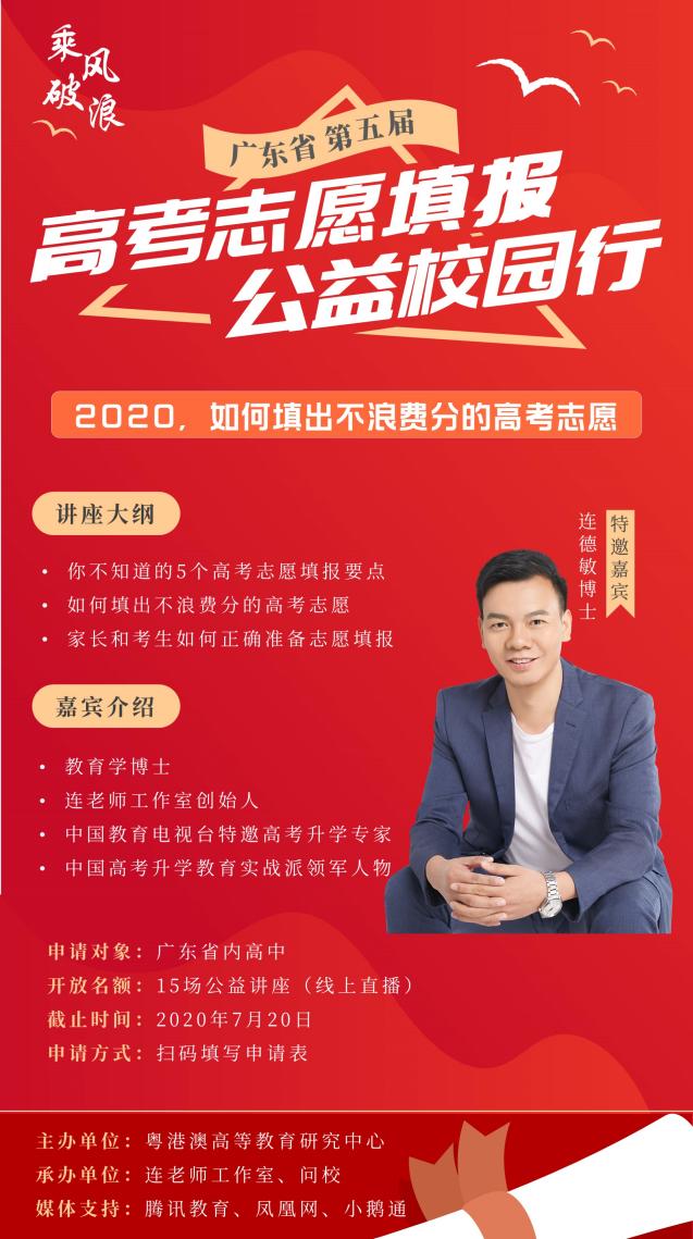 見(jiàn)圳客戶端·深圳新聞網(wǎng)2020年7月9日訊 (記者 陳彬)高考是每一位高三學(xué)子夢(mèng)想的起點(diǎn),但高考不只是一場(chǎng)考試,還有考試之后的志愿填報(bào);如何科學(xué)、專業(yè)的填報(bào)志愿,直接關(guān)系著考生能否獲得心儀大學(xué)和專業(yè)的錄取。7月6日,以《2020,如何填出不浪費(fèi)分的高考志愿》為主題的廣東省第五屆高考志愿填報(bào)公益校園行正式啟動(dòng),該活動(dòng)由粵港澳高等教育研究中心主辦,連老師工作室承辦,將面向廣東省內(nèi)高中,以學(xué)校或班級(jí)為單位,舉辦15場(chǎng)志愿填報(bào)公益講座,講座全程特邀連德敏博士擔(dān)任主講嘉賓。
