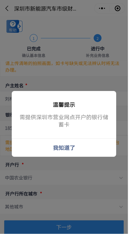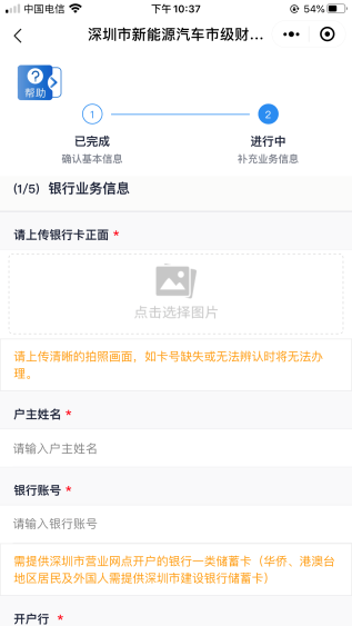 客戶(hù)需上傳銀行卡照片,并填寫(xiě)銀行賬號(hào)、開(kāi)戶(hù)行信息。開(kāi)戶(hù)行如不在選項(xiàng)范圍內(nèi)可選擇“其他”自填。其中,銀行賬號(hào)需為深圳市營(yíng)業(yè)網(wǎng)點(diǎn)開(kāi)戶(hù)的銀行一類(lèi)儲(chǔ)蓄卡,華僑、港澳臺(tái)地區(qū)居民及外國(guó)人需提供深圳市建設(shè)銀行一類(lèi)儲(chǔ)蓄卡。