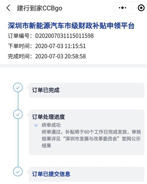 客戶(hù)可通過(guò)i深圳微信公眾號(hào)、深圳市發(fā)展和改革委員會(huì)官方網(wǎng)站或微信公眾號(hào)、深圳交警微信公眾號(hào)或建行到家CCBgo小程序登錄“深圳市新能源汽車(chē)市級(jí)財(cái)政補(bǔ)貼申領(lǐng)”平臺(tái)。