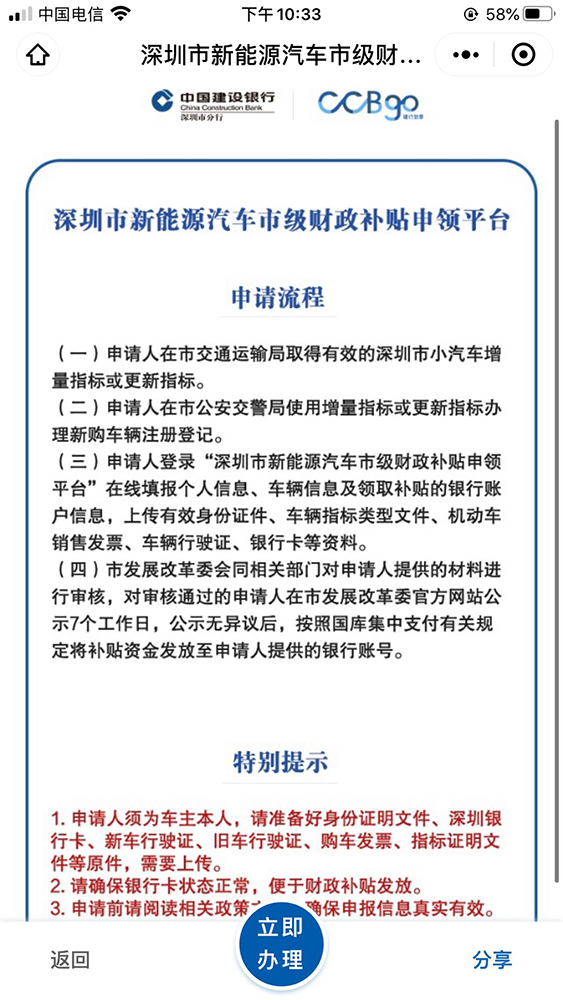 客戶(hù)進(jìn)入平臺(tái)后,可查詢(xún)平臺(tái)申請(qǐng)流程、注意事項(xiàng)。點(diǎn)擊“立即辦理”后,可進(jìn)一步在線(xiàn)閱讀《深圳市應(yīng)對(duì)新冠肺炎疫情影響促進(jìn)新能源汽車(chē)推廣應(yīng)用若干措施》、《深圳市應(yīng)對(duì)新冠肺炎疫情影響促進(jìn)新能源汽車(chē)推廣應(yīng)用若干措施財(cái)政補(bǔ)貼申領(lǐng)工作指引》等政府相關(guān)政策文件。