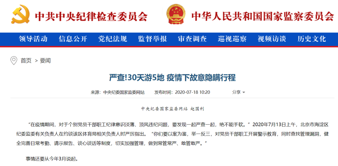 “疫情期間多次離京出國,回京后不向單位、社區(qū)報告,也不居家隔離……”2020年3月,正值全國上下防控新冠肺炎疫情的關鍵時期,北京市海淀區(qū)紀委監(jiān)委收到一條舉報線索,被舉報對象是海淀區(qū)體育局綜合管理服務中心工作人員駱某。